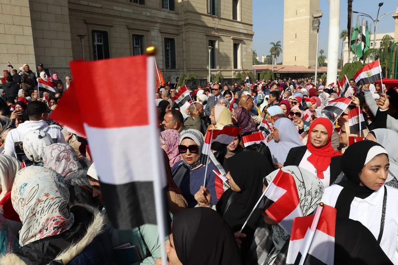 حيث رفعت حشود جامعة القاهرة من أعضاء هيئة التدريس، وعمداء ووكلاء الكليات ورؤساء الأقسام، والطلاب، والعاملين ومديري الإدارات، أعلام مصر وسط هتافات كبيرة احتفالًا بمشاركتهم في الاستحقاق الدستوري المهم الذي يحدد مستقبل الوطن، حرصًا منهم على اختيار رئيس مصر القادم.