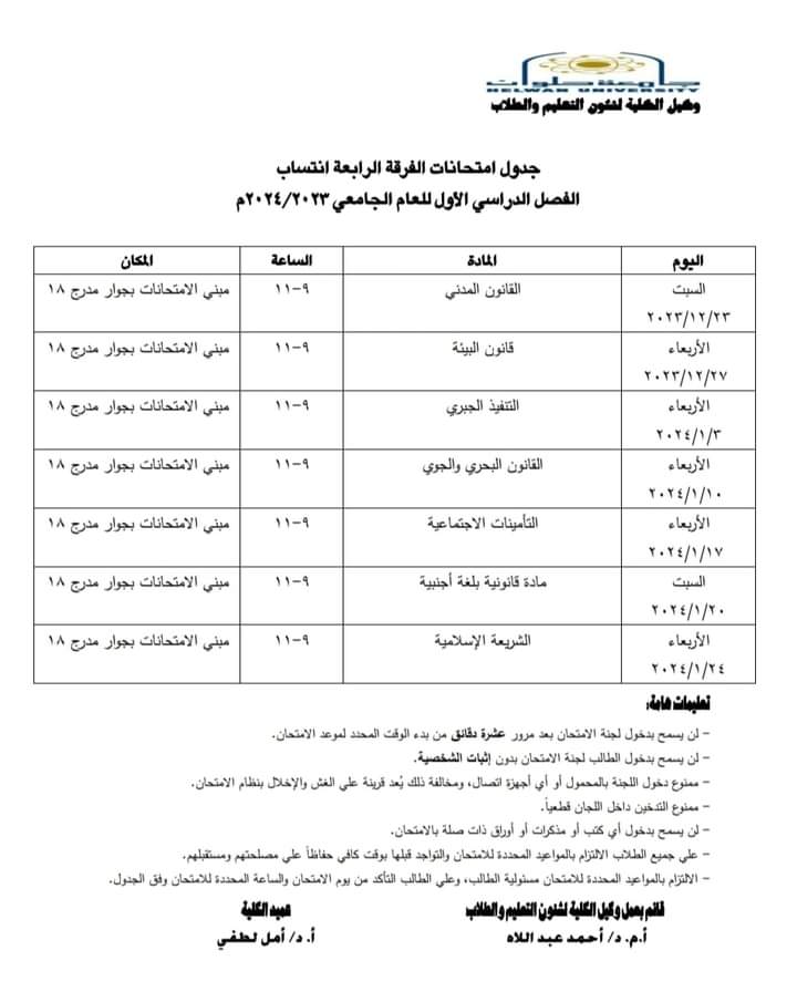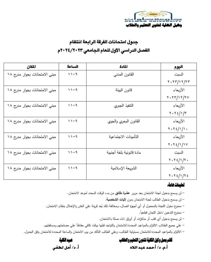 ننشر جداول امتحانات التيرم الأول للفرقة الرابعة انتظام وانتساب بكلية حقوق حلوان