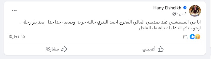 وكتب هاني الشيخ عبر حسابه الرسمي بموقع التواصل الاجتماعي فيسبوك: أنا في المستشفى عند صديقي الغالي المخرج أحمد البدري، حالته حرجة وصعبة جدا جدا بعد بتر رجله، أرجو منكم الدعاء له بالشفاء العاجل.