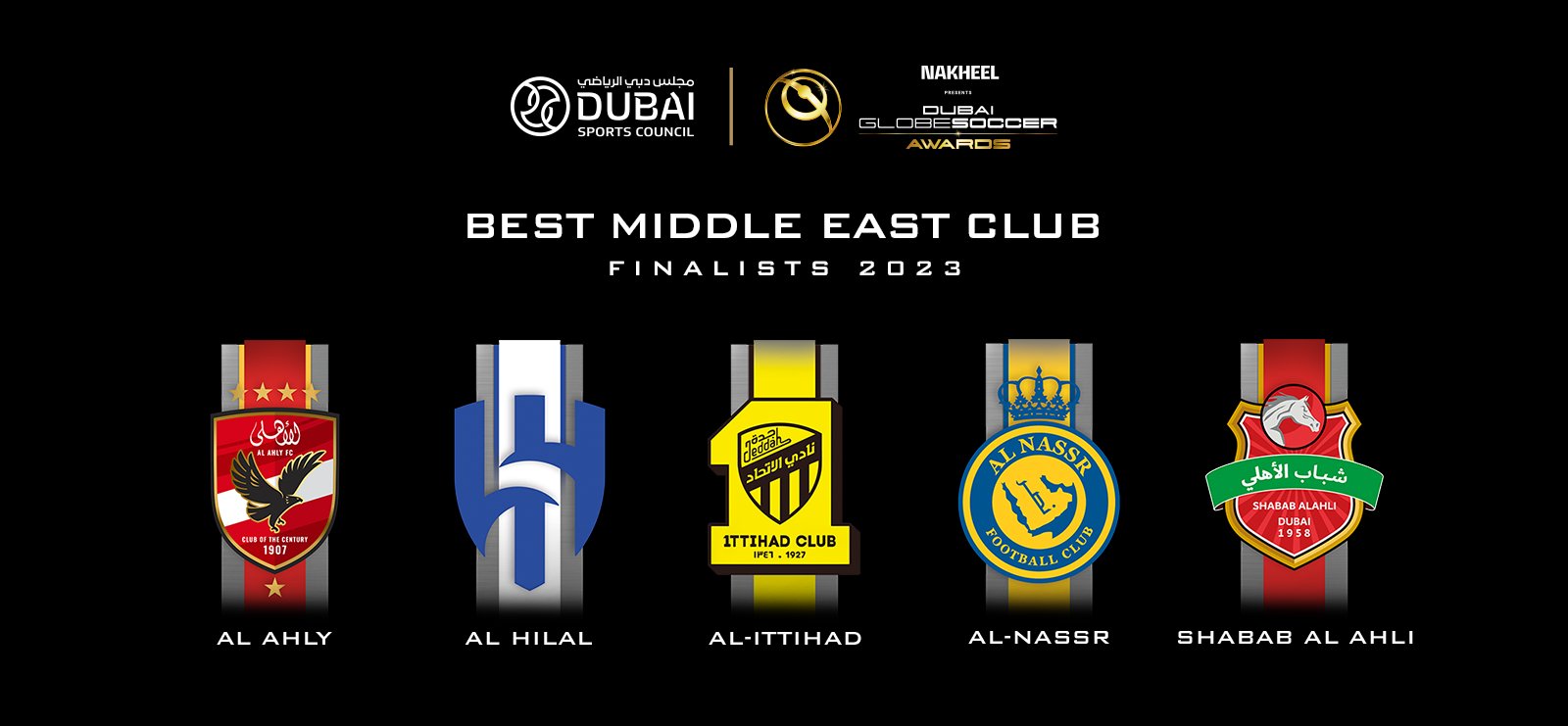 بينما القائمة النهائية لجائزة أفضل ناد في الشرق الأوسط لعام 2023 جاءت كالتالي: الأهلي المصري، الهلال السعودي، اتحاد جدة السعودي، النصر السعودي، شباب أهلي دبي الإماراتي.