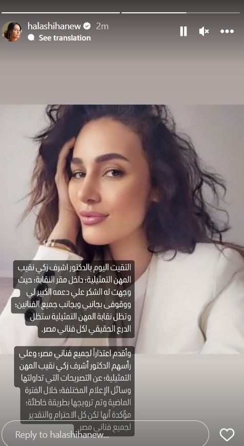وفي أول تعليق للفنانة حلا شيحة بعد جلستها مع الفنان أشرف زكي بمقر نقابة المهن التمثيلية، نشرت عبر خاصية استوري على حسابها الشخصي على موقع تبادل الصور والفيديوهات انستجرام، صورتها وكتبت عليها بيان نقابة الممثلين الذي أصدرته النقابة منذ قليل بشأن اعتذارها، والذي نص على: التقت الفنانة حلا شيحة اليوم الثلاثاء؛ بالدكتور أشرف زكي نقيب المهن التمثيلية؛ داخل مقر النقابة؛ حيث وجهت له الشكر على دعمه الكبير لها في أزمتها الأخيرة ووقوفه بجانبها وبجانب جميع الفنانين؛ مؤكدة أن نقابة المهن التمثيلية ستظل الدرع الحقيقي لكل فناني مصر.