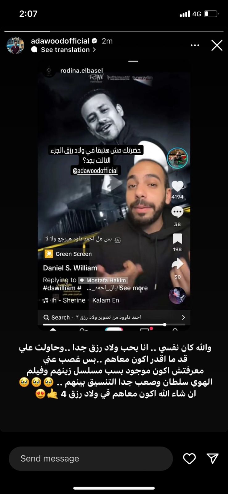 وكتب داود ستوري عبر حسابه الرسمي بموقع إنستجرام، قال بها: والله كان نفسي، أنا بحب ولاد رزق جدا، وحاولت على قد ما أقدر أكون معاهم، بس غصب عني معرفتش أكون موجود بسبب مسلسل زينهم وفيلم الهوى سلطان، وصعب جدًا التنسيق بينهم، إن شاء الله أكون معاهم في ولاد رزق 4.