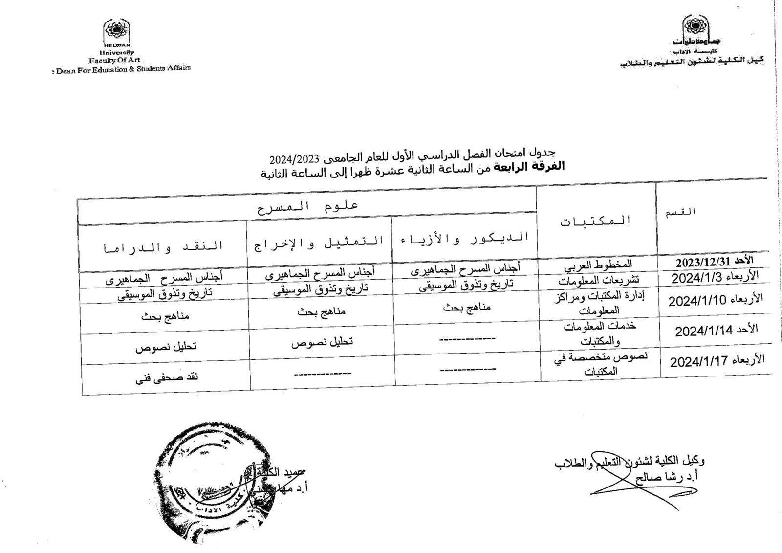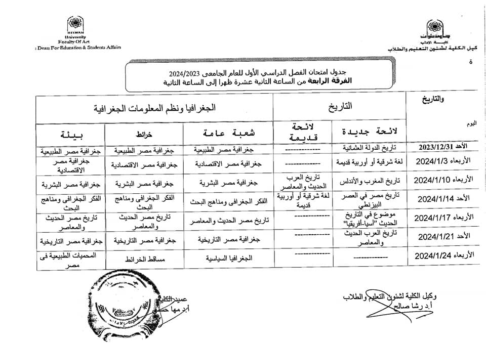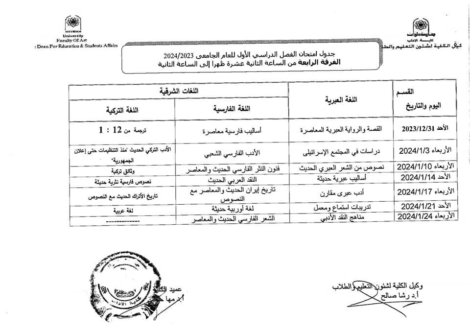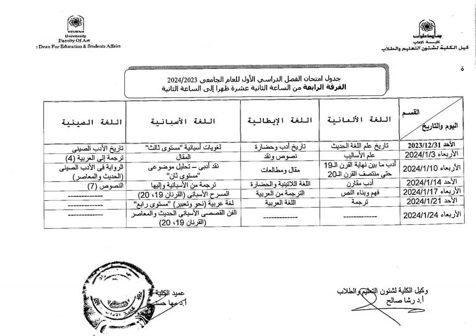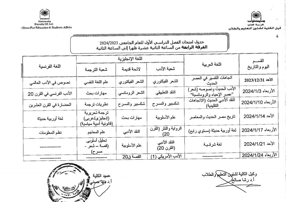 آداب حلوان تعلن جداول امتحانات الفصل الدراسي الأول 2024 للفرقة الرابعة | صور