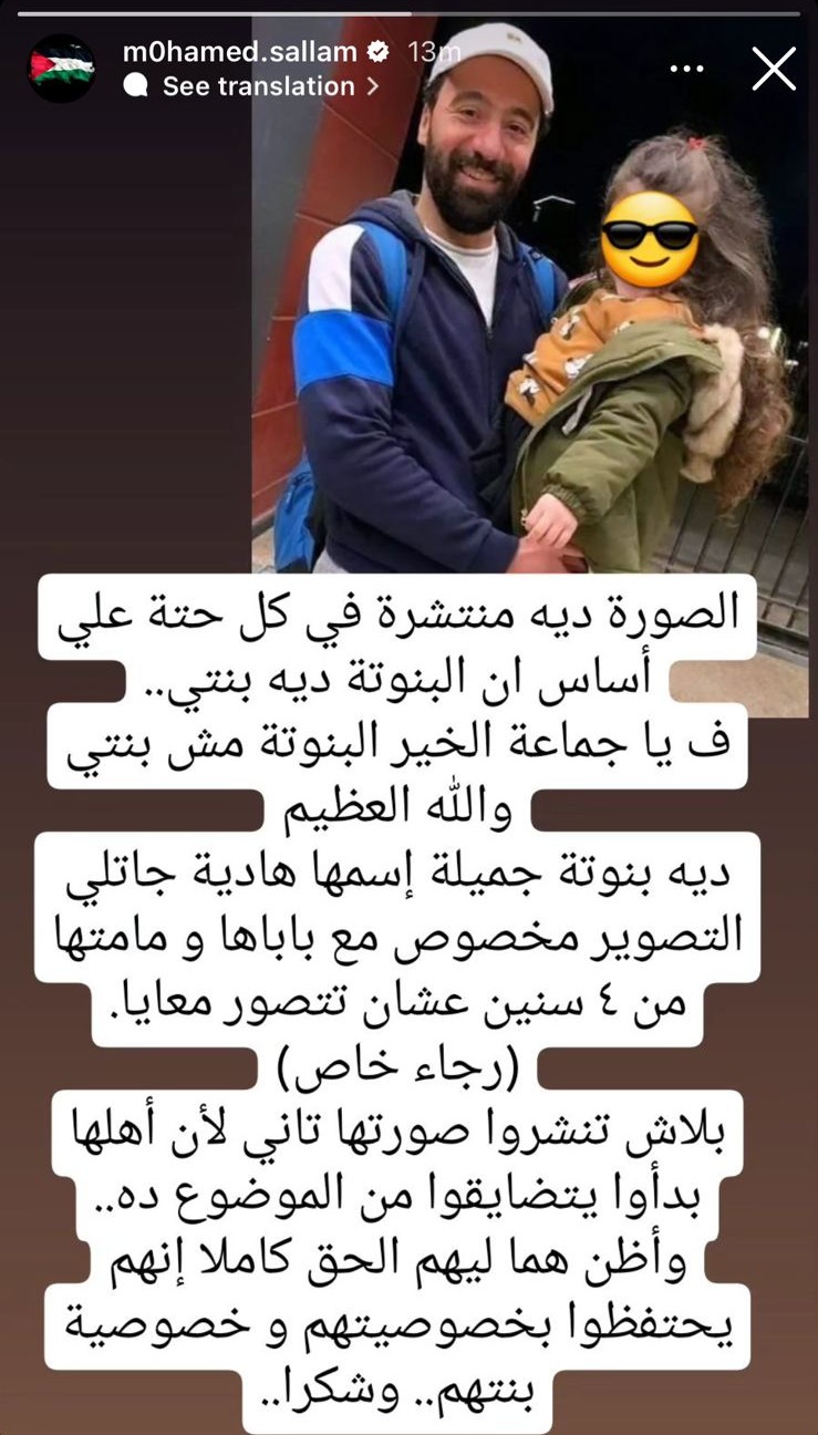ونشر محمد سلام، استوري عبر حسابه الشخصي بموقع تبادل الصور والفيديوهات القصيرة انستجرام، جاء فيه: الصورة دي منتشرة في كل حتة على أساس إن البنوتة دي بنتي، فـ يا جماعة الخير البنوتة مش بنتي، والله العظيم دي بنوتة جميلة اسمها هادية جاتلي التصوير مخصوص مع باباها ومامتها من 4 سنين عشان تتصور معايا.