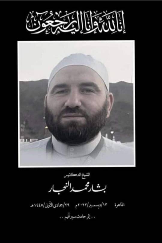 ونعت كلية الدراسات الإسلامية والعربية للبنين بالقاهرة، وفاة الشيخ بشار محمد النجار، عبر حسابها على موقع التواصل الاجتماعي فيس بوك: تُقدم كليةُ الدراسات الإسلامية والعربية للبنين بالقاهرة خالصَ العزاء والمواساة إلى أسرة الشيخ بشار محمد النجار (سوري الجنسية)، الطالب في مرحلة الدراسات العليا في كلية الدراسات الإسلامية والعربية للبنين بالقاهرة، الذي كان يستعد لمناقشة رسالة الدكتوراه في التفسير وعلوم القرآن في الخامس من يناير المقبل، وقد وافته المنية اليوم إثر حادث أليم، غفر الله له ورحمه وأسكنه فسيح جناته، للفقيد الرحمة وللأسرة خالص العزاء والمواساة.