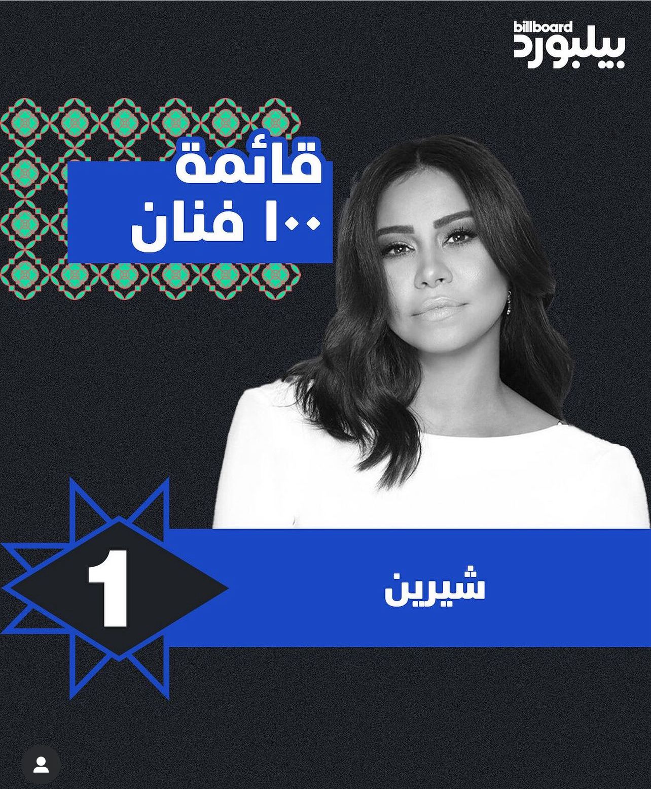 واحتلت الفنانة شيرين عبد الوهاب المرتبة الأولى في قائمة بيلبورد عربية، ضمن أفضل 10 فنانين في هذا الأسبوع من قائمة بعنوان 100 فنان، حسب ما أعلنت المنصة عبر حسابها على موقع تبادل الصور والفيديوهات انستجرام.