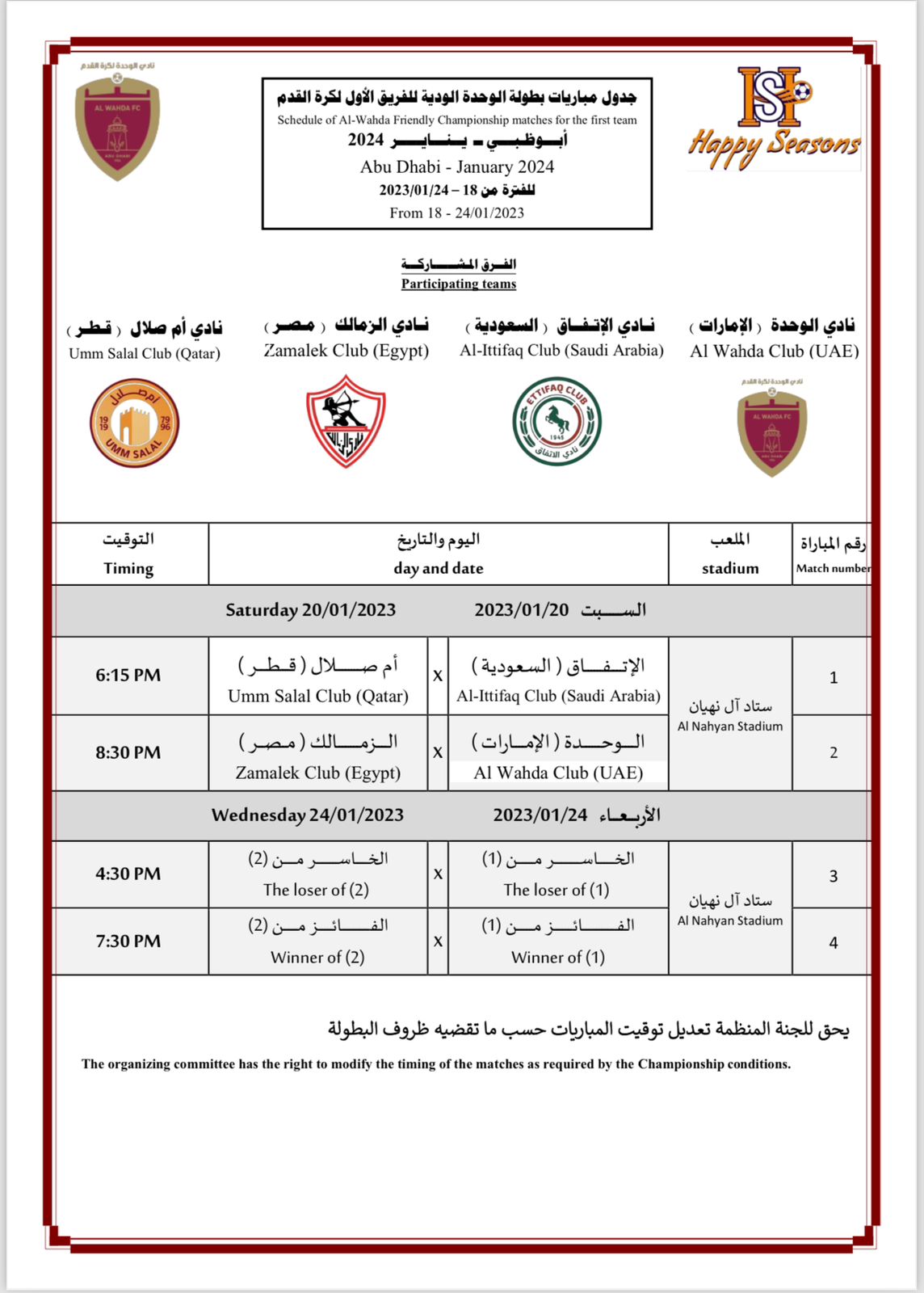 ويفتح الزمالك مبارياته بمواجهة الوحدة الإماراتي في يوم 20 يناير في تمام الساعة الثامنة والنصف مساء بينما يواجه الاتفاق السعودي فريق ام صلال القطري قبلها في نفس اليوم في تمام الساعة السادسة والربع.