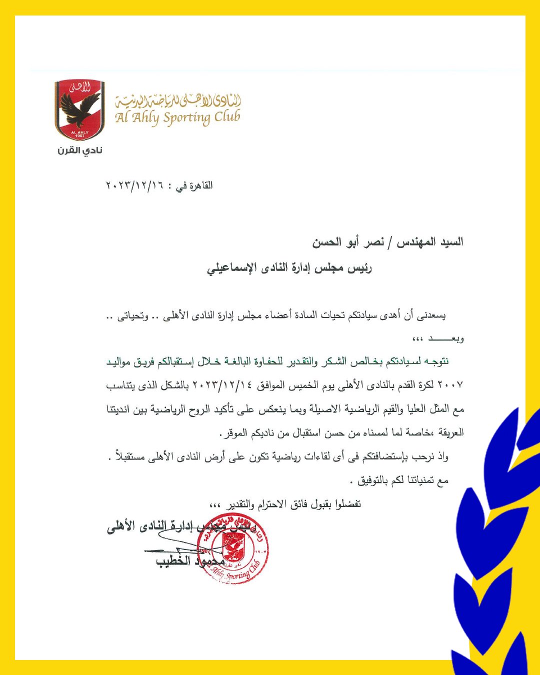وجاء بيان مجلس إدارة النادي الأهلي: نتوجه لسيادتكم بخالص الشكر والتقدير للحفاوة البالغة خلال استقبالكم فريق مواليد 2007 لكرة القدم بالنادي الأهلي يوم الخميس الموافق 14 ديسمبر 2023 بالشكل الذي يتناسب