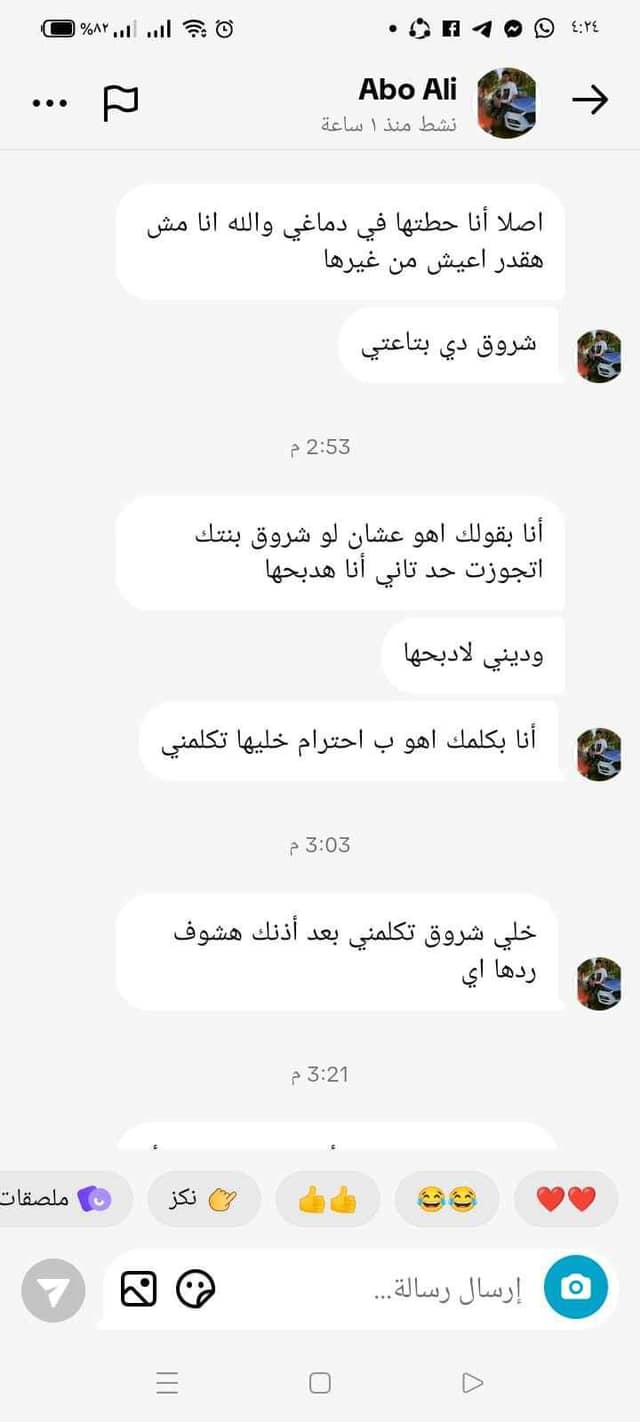ونشرت شروق أشرف شقيقة نيرة أشرف عبر صفحتها الشخصية: الشخص ده باعت رسايل لـ بابا، بيقول فيها هخلص عليكي زي أختك لو متجوزتنيش، ونفس الكلام ونفس طريقه محمد عادل السفاح اهو، انت مفكرني هخاف ولا إيه ولا انت ولا عشرة زيك يخوفني، بس أقسم بالله ما هنسكت انتوا مفكرينا زي زمان ولا إيه، ده المرضى بقوا كتير أوي ربنا يخلصنا منكم يا رب.