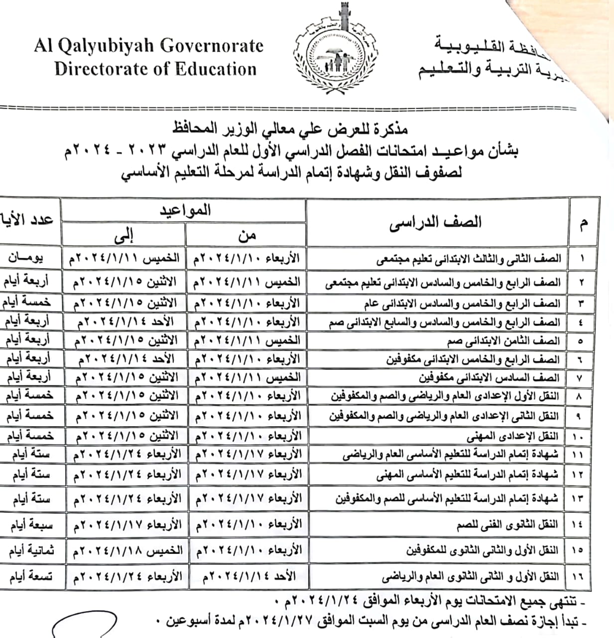محافظ القليوبية يعتمد جداول امتحانات الفصل الدراسي الأول للعام الدراسي الحالي لصفوف النقل