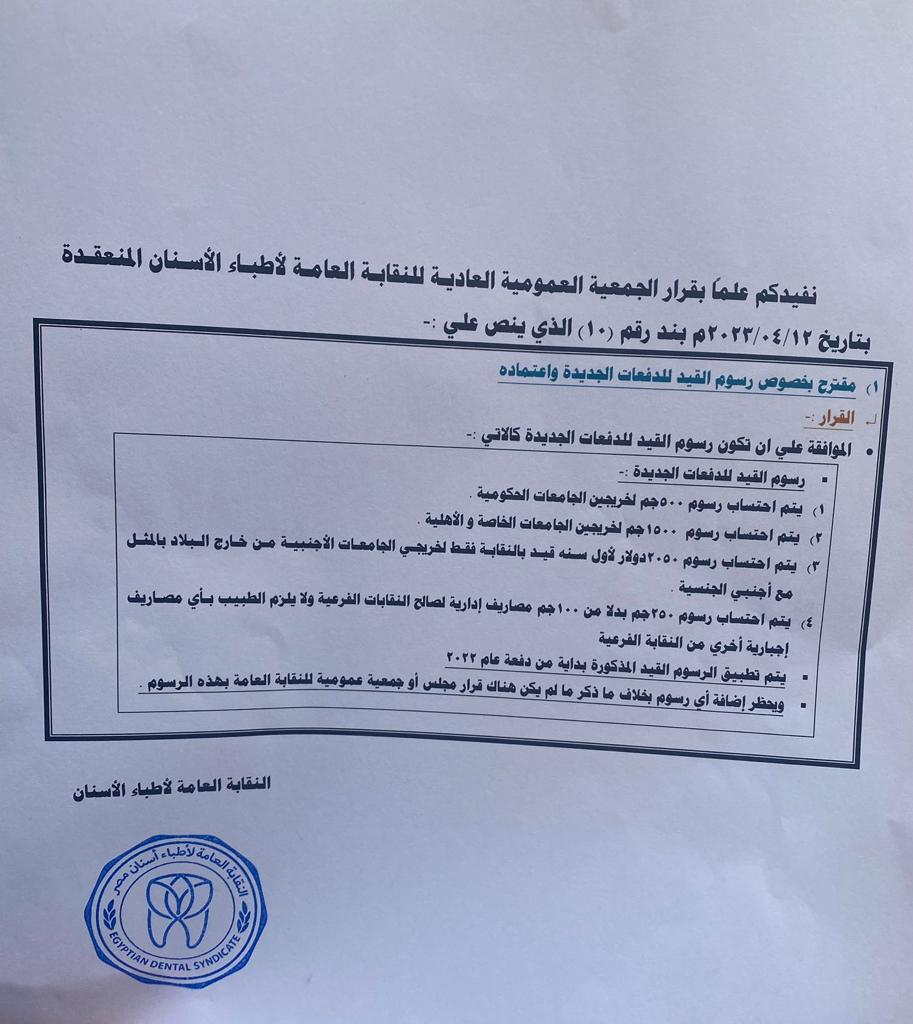 قرار الجمعية العمومية يخضع لمراجعة من المستشار القانوني للنقابة، وهو ما أكده النقيب العام لأطباء الأسنان، وأن هذا القرار تم عرضه على المستشار القانوني وممثل من الجهاز المركزي للمحاسبات خلال الجمعية العمومية ولم يُبدِ أيٌّ منهما اعتراضا عليه، مشيرا إلى أن تجديد القيد بعد ذلك سيكون بالجنيه المصري.