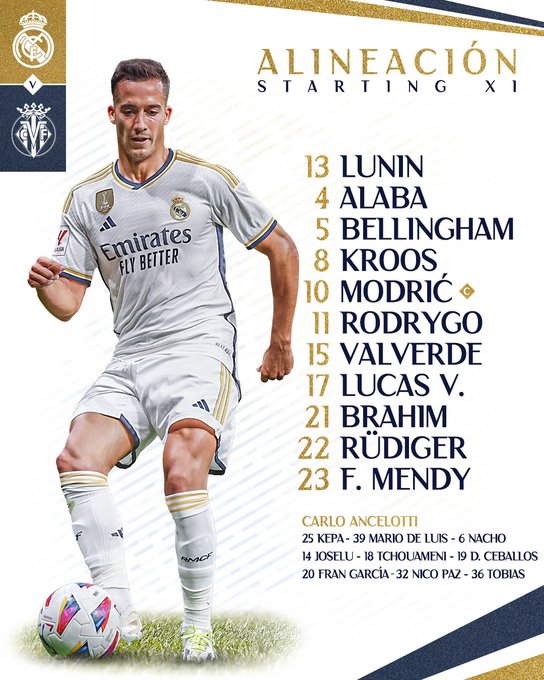 وتواجد رودريجو وبيلينجهام على رأس تشكيل ريال مدريد لمواجهة فياريال، فيما دفع المدرب الإيطالي بالحارس لونين أساسيًا مع إبقاء كيبا على مقاعد البدلاء.