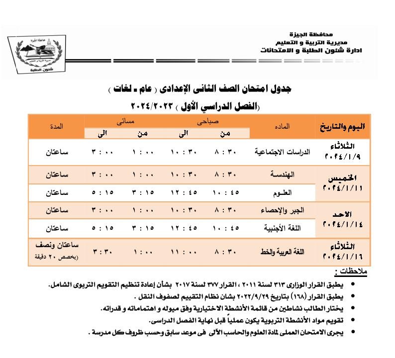جدول امتحانات الصف الثاني الإعدادي الترم الأول 2024 الجيزة