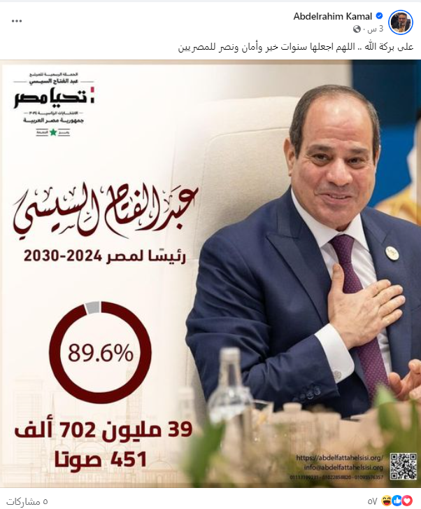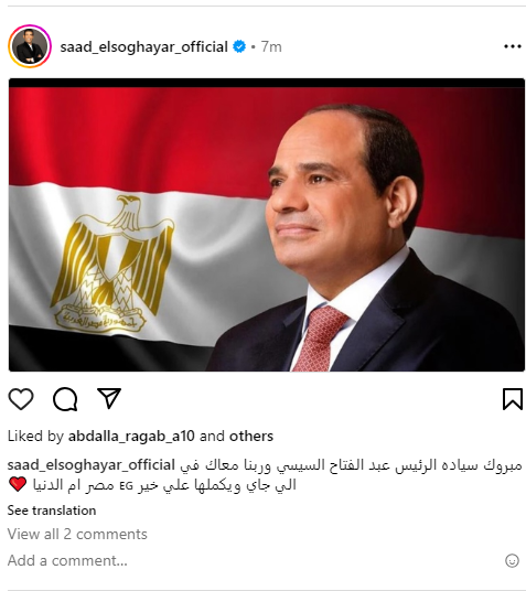 وهنأ المطرب الشعبي سعد الصغير الرئيس عبد الفتاح السيسي لفوزه في الانتخابات الرئاسية: مبروك سيادة الرئيس عبد الفتاح السيسي وربنا معاك في اللي جاي ويكملها علي خير 🇪🇬 مصر أم الدنيا.