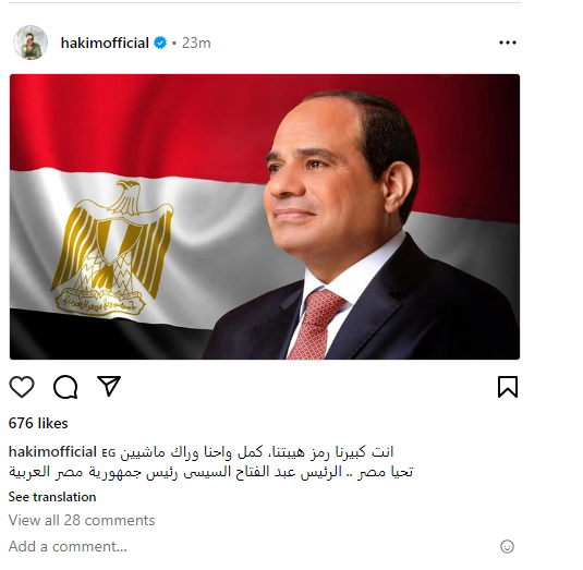 وكتب المطرب الشعبي حكيم عبر حسابه بموقع إنستجرام: أنت كبيرنا رمز هيبتنا وإحنا وراك ماشيين، تحيا مصر، الرئيس عبد الفتاح السيسي رئيس جمهورية مصر العربية.