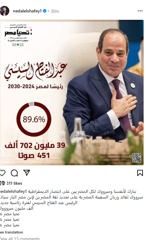 وكتب الفنان نضال الشافعي عبر حسابه بموقع انستجرام: نبارك لأنفسنا ومبرووك لكل المصريين على انتصار الديمقراطية، مبروك لقائد وربان السفينة المصرية على تجديد ثقة المصريين لابن مصر البار الرئيس عبد الفتاح السيسي لفترة رئاسية جديدة ألف مليون مبروووك.