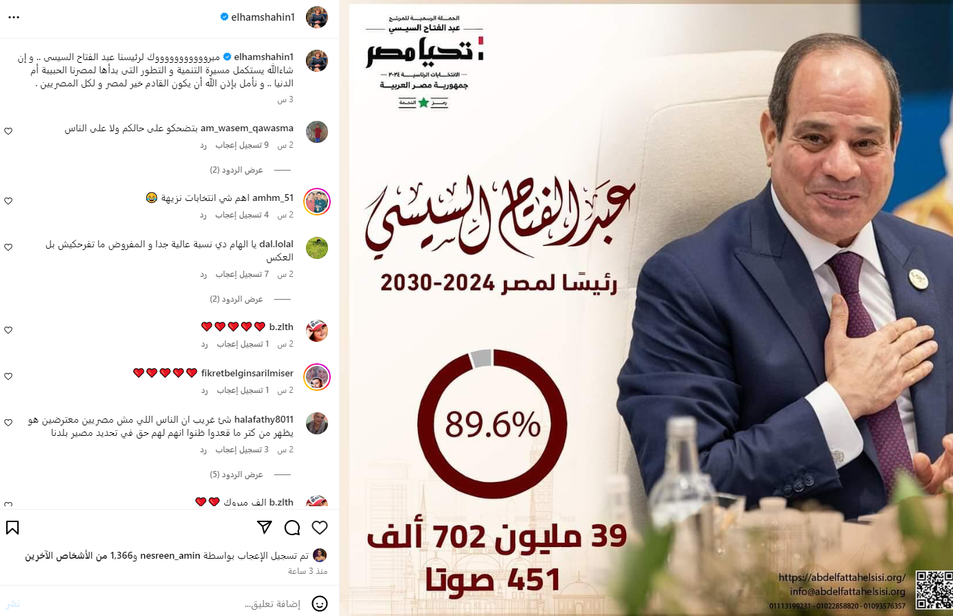 وأعربت إلهام شاهين عن سعادتها بفوز الرئيس السيس وكتبت عبر حسابها بموقع إنستجرام: مبروك لرئيسنا عبد الفتاح السيسي.. وإن شاءالله يستكمل مسيرة التنمية والتطور التي بدأها لمصرنا الحبيبة أم الدنيا.. ونأمل بإذن الله أن يكون القادم خير لمصر ولكل المصريين.