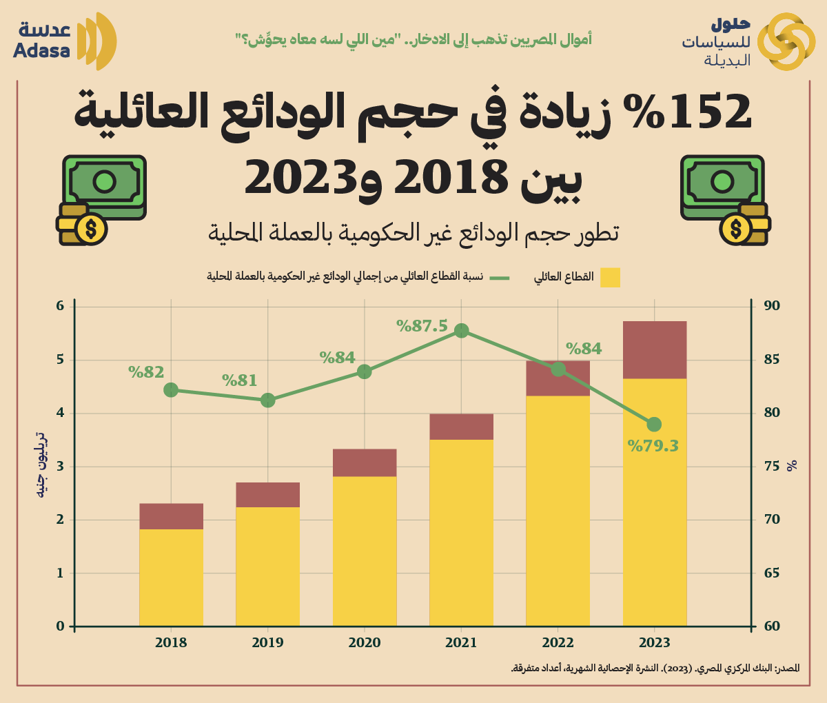 بالرغم من تآكل عوائد المنتجات المصرفية أمام معدلات التضخم فإن انخفاض معدلات المخاطرة في الادخار من خلال المنتجات المصرفية مقارنة مع الأوعية الأخرى، دفع ودائع القطاع العائلي بالبنوك إلى نمو مستمر، وخاصة بالتزامن مع تحركات سعر الصرف المتبوعة بطرح منتجات تبدو مرتفعة العائد لامتصاص السيولة المحلية من السوق في إجراء تقليدي لمكافحة التضخم.