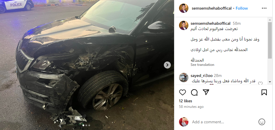 منذ قليل، شارك سمسم شهاب جمهوره مجموعة من الصورة عبر حسابه الشخصي بموقع إنستجرام، لسيارته أثناء تعرضه لحادث سير فجر اليوم، وعلق عليها قائلًا: تعرضت لحادث أليم فجر اليوم، ونجوت أنا ومن معي بفضل الله تعالى، الحمد لله ربنا أنقذني من أجل أولادي.
