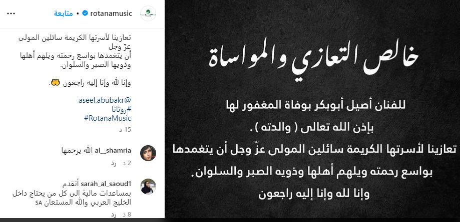 ومن جانبها، حرصت شركة روتانا على نعي ووالفد الفنان أصيل أبو بكر، إذ كتبت منشورًا عبر صفحتها الرسمية بموقع إنستجرام، جاء فيه: خالص التعازي والمواساة للفنان أصيل أبوبكر، بوفاة المغفور لها بإذن الله تعالى والدته.