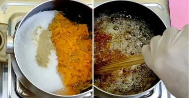 - بعد اختفاء السكر في الماء، أضيفي الجزر المبشور وبشر البرتقال وعصير الليمون، ثم غطي القدر وقلبي من فترة لأخرى.