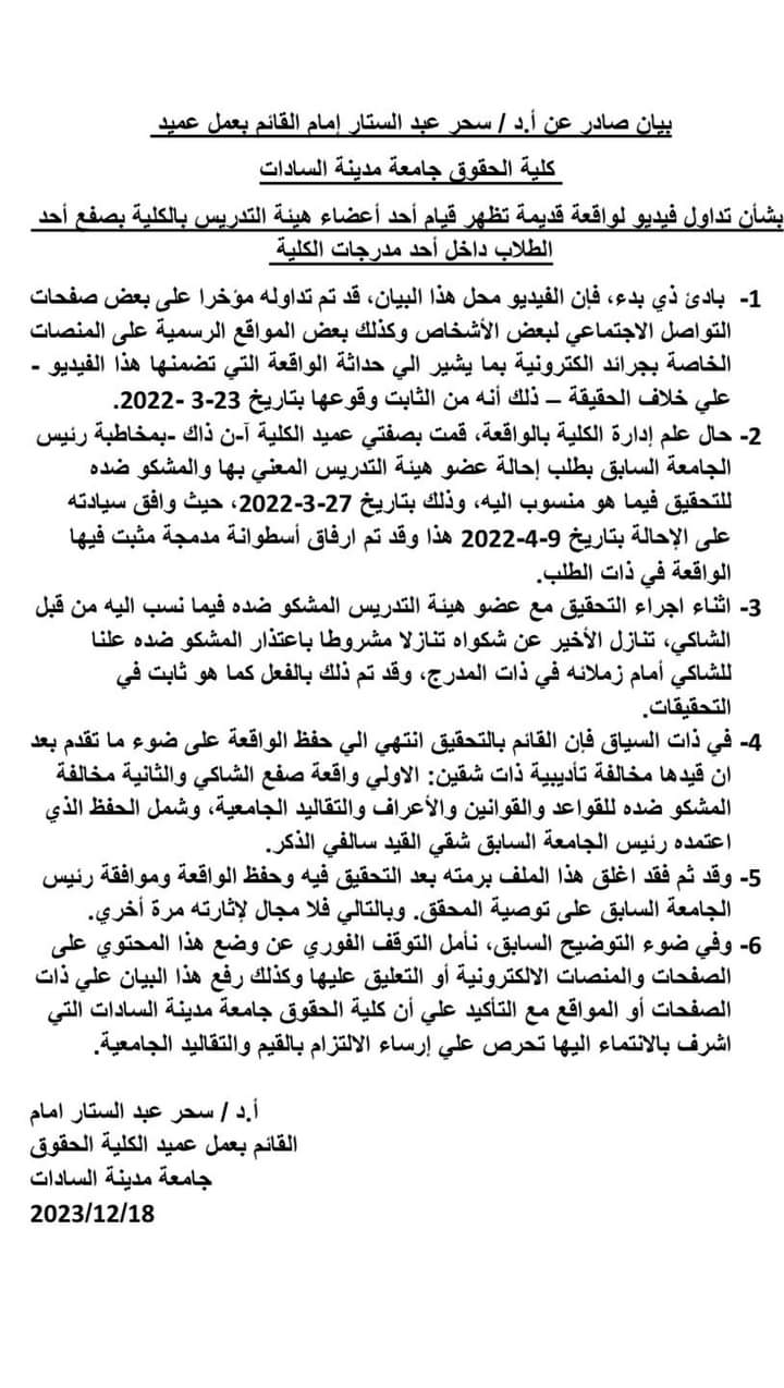 وقالت الدكتور سحر عبد الستار، القائم بأعمال كلية الحقوق جامعة السادات: إنه تم تداول هذا الفيديو مؤخرا على بعض صفحات التواصل الاجتماعي لبعض الأشخاص، وكذلك بعض المواقع الرسمية على المنصات الخاصة بالجرائد الإلكترونية بما يشير إلى حداثة الواقعة التي تضمنها هذا الفيديو على خلاف الحقيقة، ذلك أنه من الثابت وقوعها بتاريخ 23-3-2022 2 حال علم إدارة الكلية بالواقعة، قمت بصفتي عميد الكلية أن ذاك بمخاطبة رئيس الجامعة السابق بطلب إحالة عضو هيئة التدريس المعني بها والمشكو ضده للتحقيق فيما هو منسوب اليه، وذلك بتاريخ 27-3-2022.