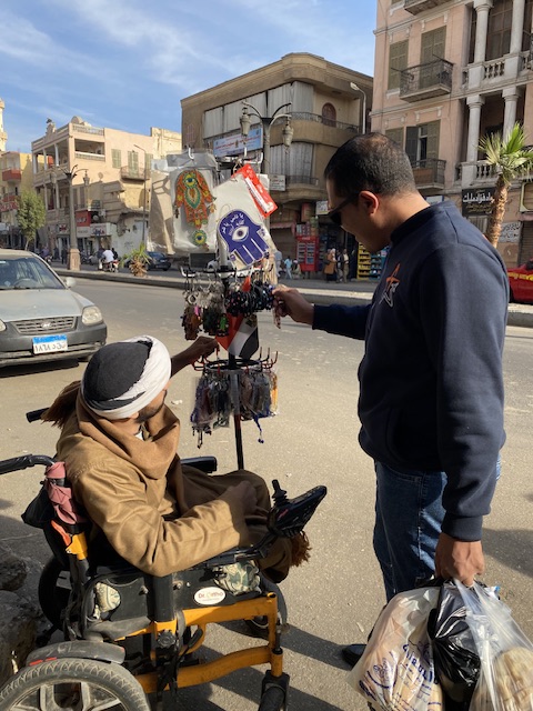 يتجول بكرسيه المتحرك بوجه باسم بشوارع مدينة الأقصر واضعا مجموعة من السبح والميداليات على فاترينة صنعها متصلة بمقعدة ليعلق عليها بضاعتة تلك مناديا عليها بقولة مدد يارب.