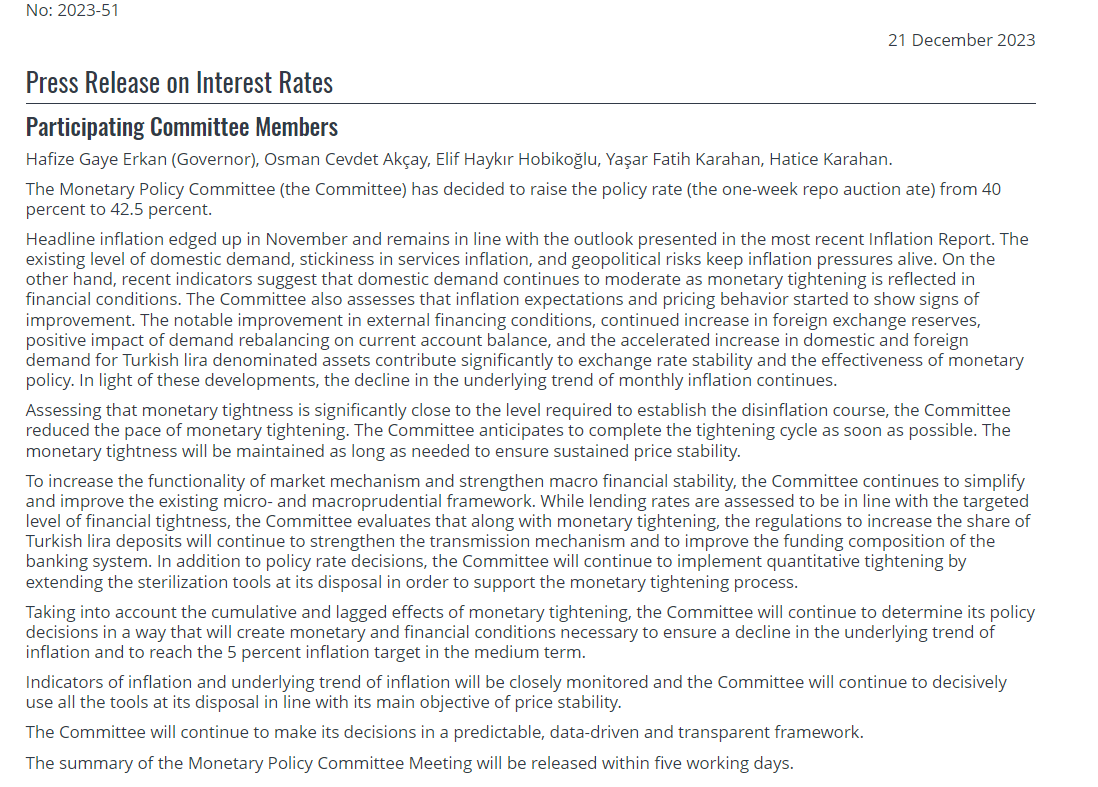 أصدرت لجنة السياسات النقدية في البنك المركزي التركي، قرارًا مهمًا خلال اجتماعها اليوم الخميس 21 ديسمبر 2023، برفع سعر الفائدة للمرة السابعة على التوالي في البنوك التركية، لتصل إلى 42.5%.