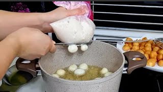 - ضعي العجينة في كس حلواني وقطعيها بالمقص أو بملعقة مدهونة زيت شكليها في الزيت كرات صغيرة.
