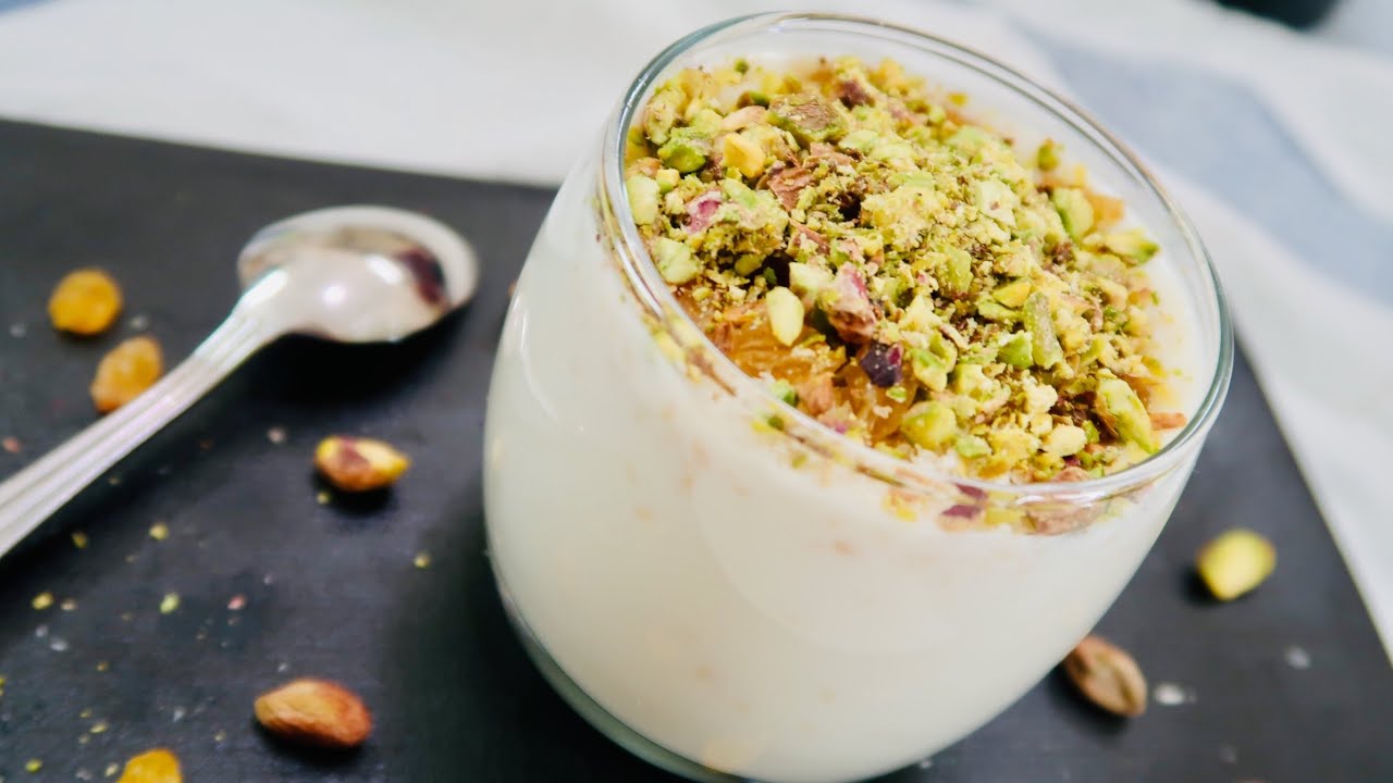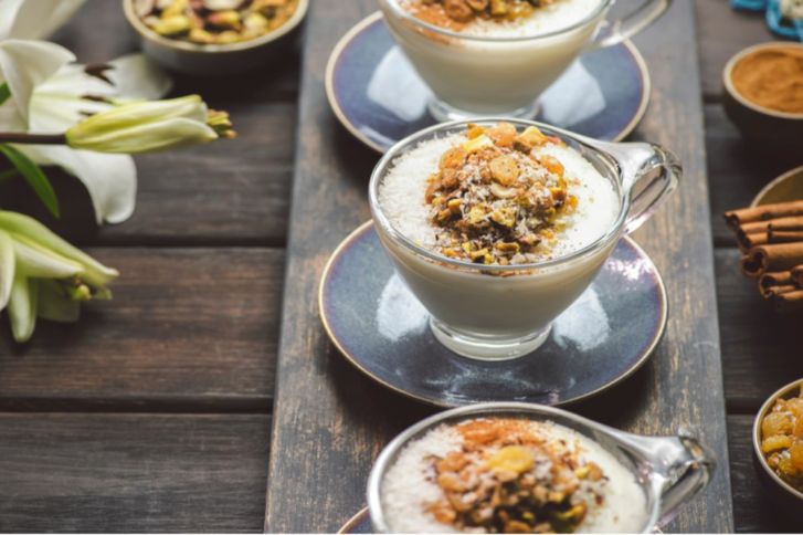 اسكبي السحلب في أكواب، ثم زينيه بالمكسرات وجوز الهند.
