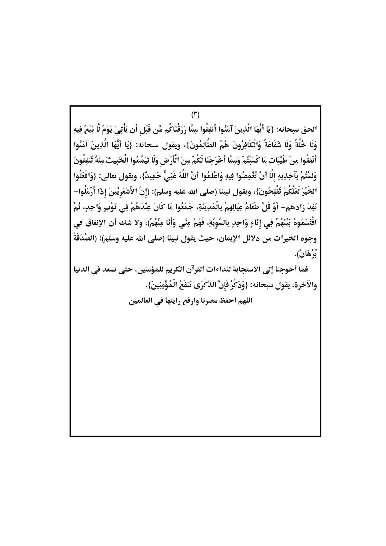 "الحمد لله رب العالمين، القائل في كتابه الكريم: {يَا أَيُّهَا الَّذِينَ آمَنُوا اسْتَجِيبُوا لِلَّهِ وَلِلرَّسُولِ إِذَا دَعَاكُمْ لِمَا يُحْيِيكُمْ وَاعْلَمُوا أَنَّ اللَّهَ يَحُولُ بَيْنَ الْمَرْءِ وَقَلْبِهِ وَأَنَّهُ إِلَيْهِ تُحْشَرُونَ، وأشهد أن لا إله إلا الله وحدَهُ لا شَريكَ لَهُ، وأشهد أن سيدنا ونبينا مُحَمَّدًا عبده ورسوله، اللهُمَّ صَلِّ وسلم وبارك عليه، وعلى آله وصحبه، ومَنْ تَبِعَهُمْ بِإِحسان إلى يوم الدين، وبعد: فإن المتأمل في القرآن الكريم يجده حافلًا بنداءات الله (عز وجل) لعباده | المؤمنين، وهي نداءات تتضمن توجيهات سامية وإرشادات عظيمة تحمل الخير للدنيا كلها، يقول سيدنا عبد الله بن مسعود رضي الله عنه: "إذا سمعت الله تعالى يقول: {يَا أَيُّهَا الَّذِينَ آمَنُوا فأرعها سمعك؛ فإما خير تُؤمر به، وإما شر تنهى عنه".