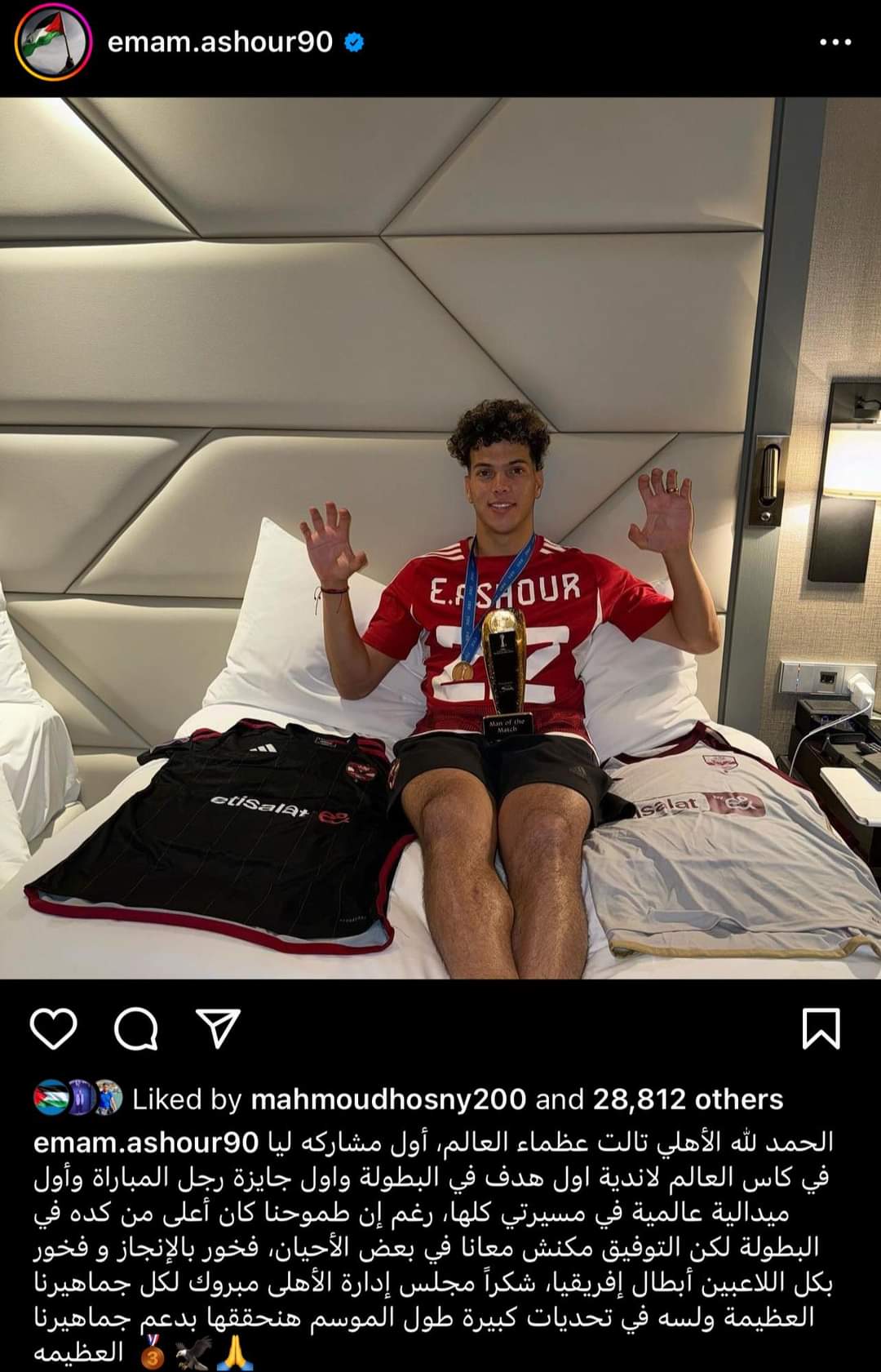 نشر إمام عاشور صورة بالميدالية البرونزية عبر حسابه على إنستجرام معلقًا: الحمد لله الأهلي تالت عظماء العالم، أول مشاركه ليا في كأس العالم للأندية، أول هدف في البطولة وأول جايزة رجل المباراة.