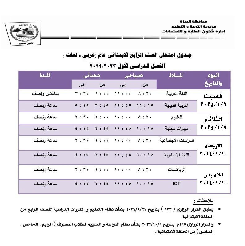 جدول امتحانات الفصل الدراسي الأول لطلاب الرابع الابتدائي بالجيزة