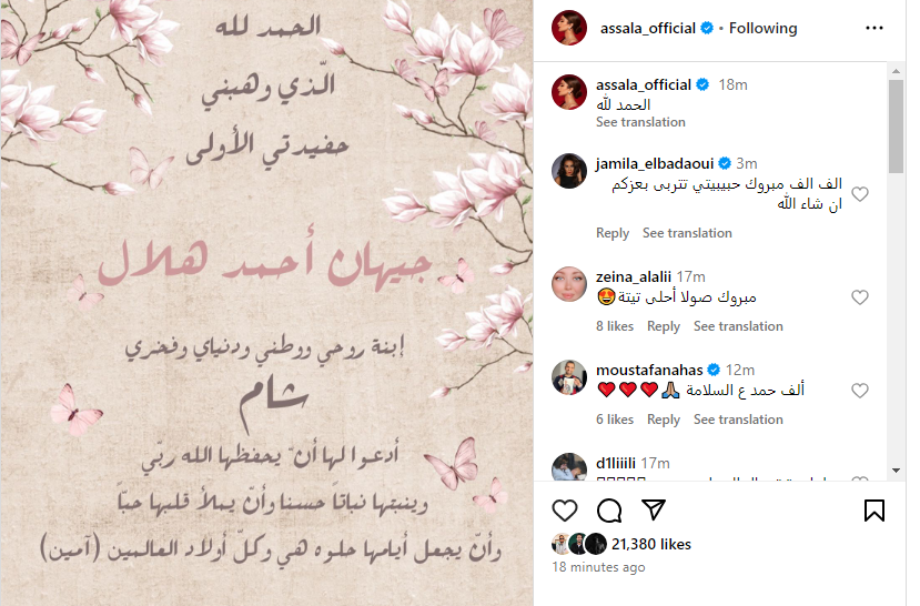 ونشرت أصالة على حسابها الرسمي بـ انستجرام صورة، وعلقت عليها قائلة: الحمد الله الذي وهبني حفيدتي الأولى.. جيهان أحمد هلال ابنة روحي ووطني ودنياي وفخري شام.. ادعو لها أن يحفظها الله ربي وينبتها نباتًا حسنا وأن يملأ قلبها حبًا.. وأن يجعل أيامها حلوة هي وكل أولاد العالمين.