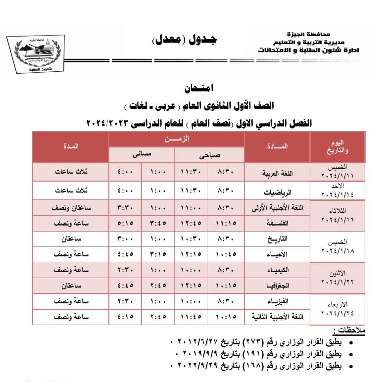 جدول امتحانات الصف الأول الثانوي بالجيزة بعد التعديل