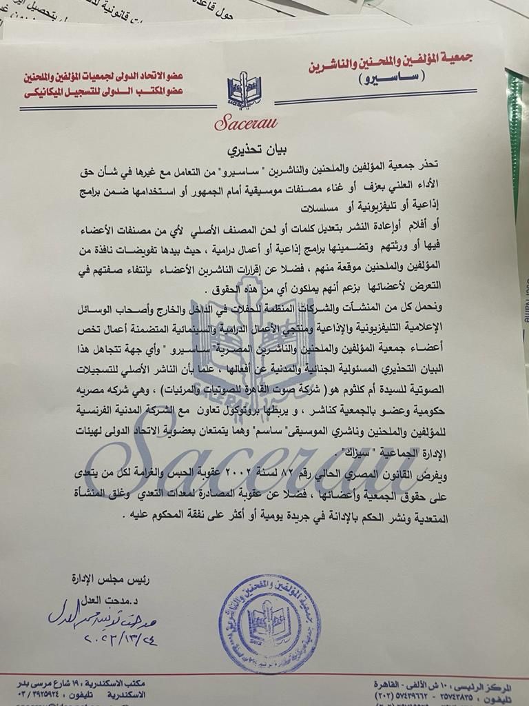 وجاء نص البيان كالتالي: بيان تحذيري.. تحذر جمعية المؤلفين والملحنين والناشرين من التعامل مع غيرها في شأن حق الأداء العلني بالعزف أو غناء مصنفات موسيقية أمام الجمهور أو استخدامها، ضمن برامج إذاعية أو تلفزيونية، أو مسلسلات، أو أفلام أو إعادة نشر، بتعديل الكلمات، أو لحن المصنف الأصلي، لأي من منصنفات، الأعضاء فيها أو ورثتهم وتضمنها برامج إذاعية أو أعمال درامية.