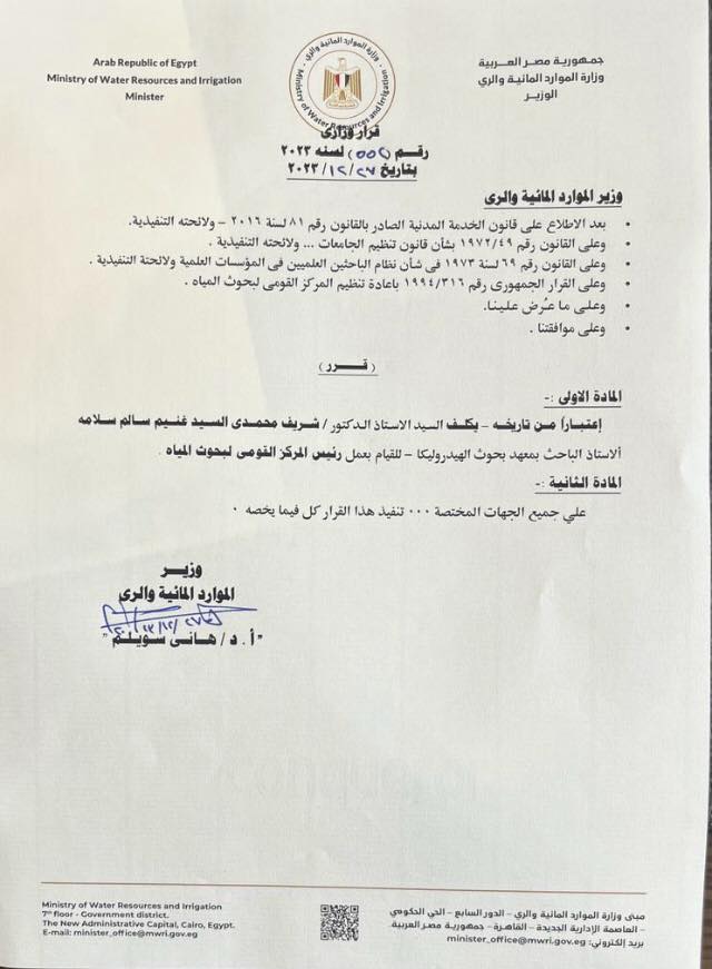 وأوضحت الوزارة أن قرار تكليف شريف محمدى السيد غنيم سالم سلامة برئاسة المركز، جاء بعد الاطلاع على قانون الخدمة المدنية الصادر بالقانون رقم 81 لسنة 2016- ولائحته التنفيذية، وعلى القانون رقم 1972/19 بشأن قانون تنظيم الجامعات، ولائحته التنفيذية، وعلى القانون رقم 69 لسنة 1973 في شأن نظام الباحثين العلميين في المؤسسات العلمية ولائحتة التنفيذية، وعلى القرار الجمهورى رقم 1994/316 باعادة تنظيم المركز القومي لبحوث المياه.