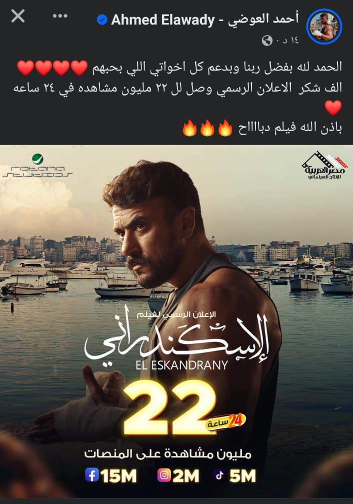 أعرب الفنان أحمد العوضي عن سعادته، بوصول البرومو الرسمي لـ فيلمه الجديد الاسكندراني إلى 22 مليون مشاهدة، بعد 24 ساعة فقط، من طرحه للبرومو عبر مواقع التواصل الاجتماعي.