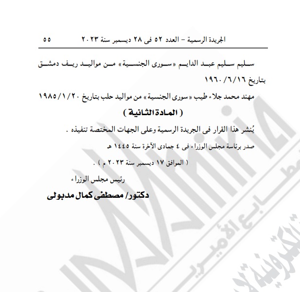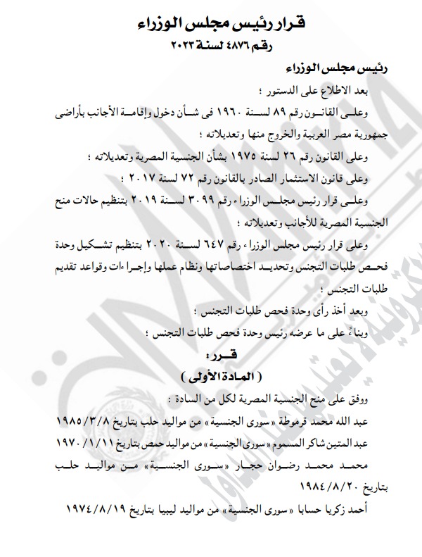 نشرت الجريدة الرسمية قرار رئيس مجلس الوزراء رقم 4876 لسنة 2023، بشأن منح الجنسية المصرية لـ 6 أشخاص سوريين.