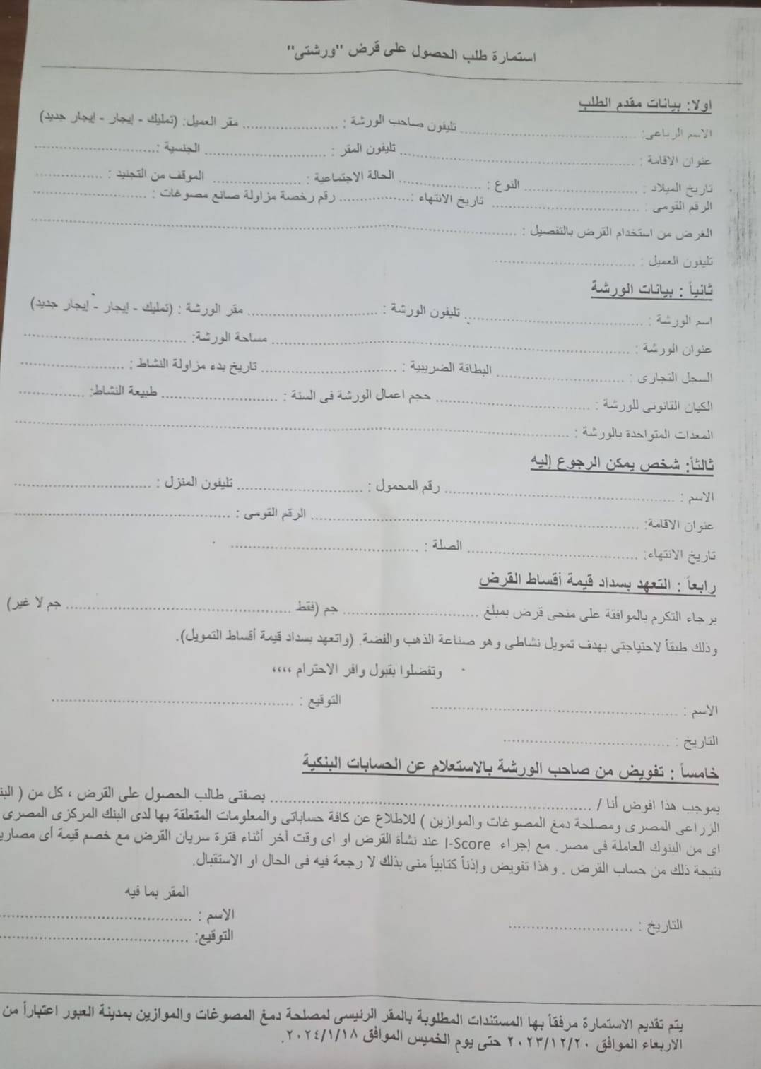 الاسم الرباعي، تليفون صاحب الورشة، مقر العميل "تمليك ـ ايجار ـ ايجار جديد"، عنوان الاقامة، تليفون المقر، الجنسية، تاريخ الميلاد، النوع، الحالة الاجتماعية، الموقف من التجنيد، الرقم القومي وتاريخ انتهائها، رقم رخصة مزاولة صانع مصوغات، الغرض من استخدام القرض بالتفصيل، تليفون العميل.