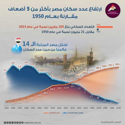 وأشار المركز في تقريره، إلى أن التعداد السكاني بلغ 105 ملايين نسمة في عام 2023، مقابل 21 مليون نسمة في عام 1950، كما أن مصر تحتل المرتبة الـ 14 عالميا من حيث عدد السكان.