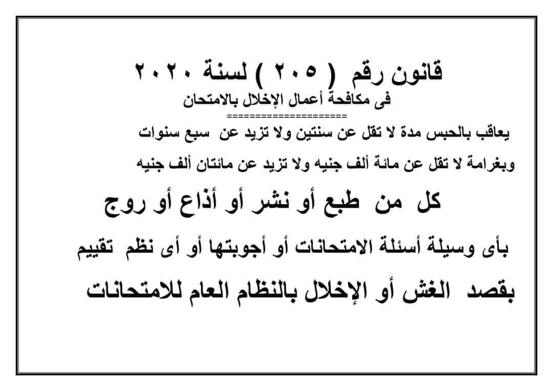 وأوضحت كلية الحقوق بجامعة المنوفية أن نص المادة 205 لسنة 2020 في مكافحة أعمال الإخلال بالامتحان، تؤكد على أنه يعاقب بالحبس كدة لا تقل عن سنتين ولا تزيد عن سبع سنوات، وبغرامة لا تقل عن 100 ألف جنيه ولا تزيد عن 200 ألف جنيه، لكل من طبع ونشر أو أذاع أو روج بأي وسيلة أسئلة الامتحانات أو أجوبتها أو أي نظم تقييم بقصد الغش أو الإخلال بالنظام العام للامتحانات.