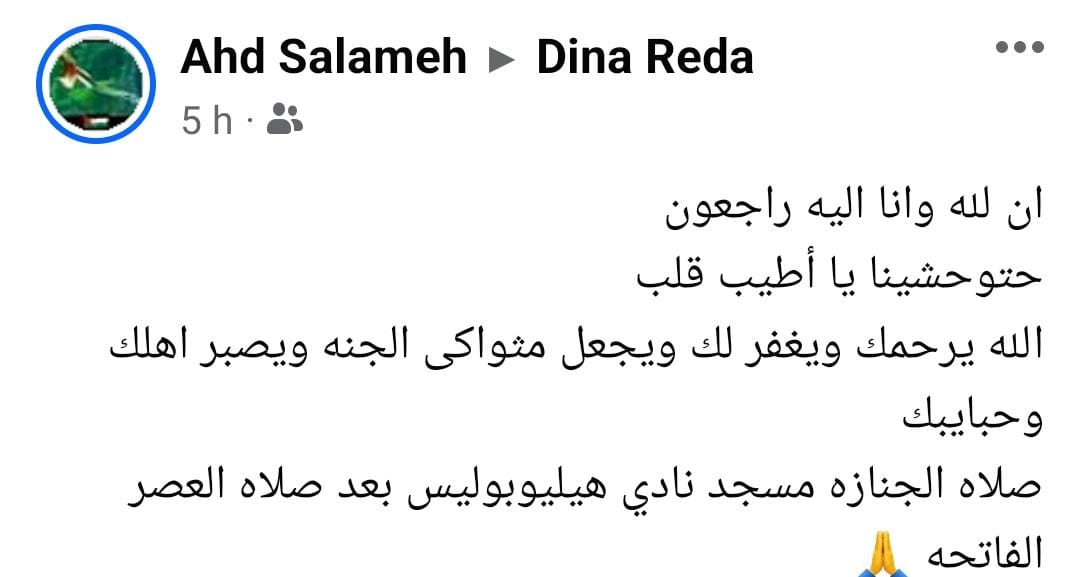 وأعلن أحد أقارب دينا عبر صفحته الشخصية على فيس بوك: إنا الله وإنا إليه راجعون.. هتوحشينا يا أطيب قلب.. الله يرحمك ويغفر لك ويجعل مثواكي الجنة، ويصبر أهلك وحبايبك.