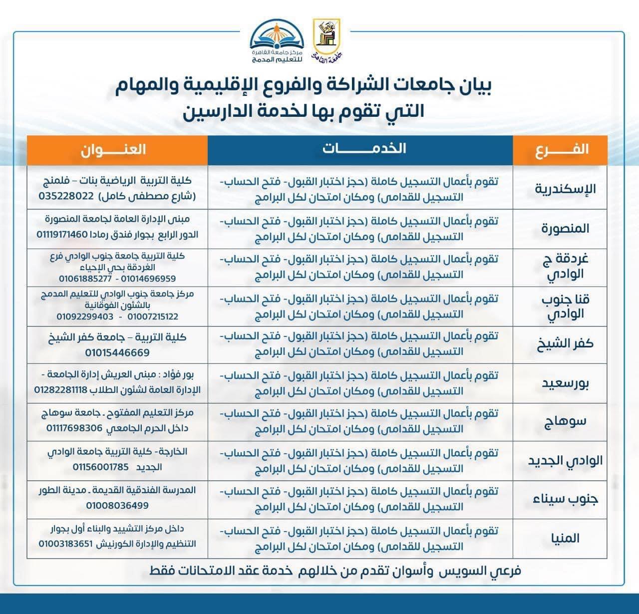 وجاء في الإعلان: للطلاب، إذا كنت ترغب في الالتحاق ببرامج التعليم المدمج جامعة القاهرة ولا يمكنك الحضور لمقر المركز، فيمكنك الآن التواصل مع الفروع التالية: