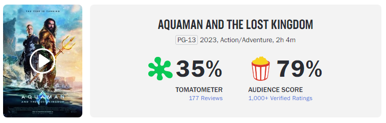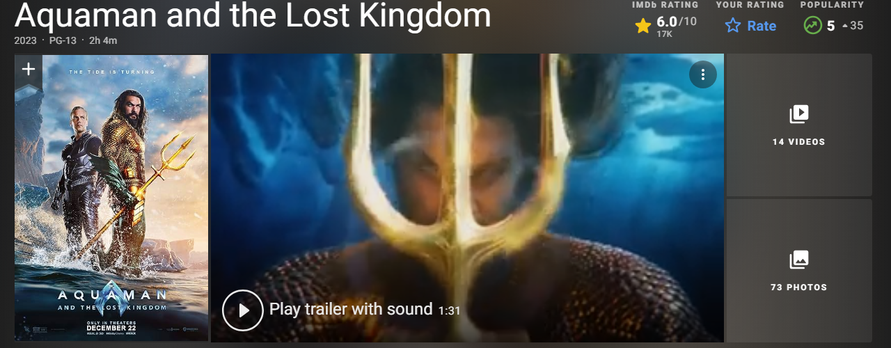 بينما أتى تقييم فيلم Aquaman 2 مشابهًا للجزء الأول على موقع IMDb، فالجزء حصل على تقييم 10/6، والجزء الأول على تقيم 10/6.8.
