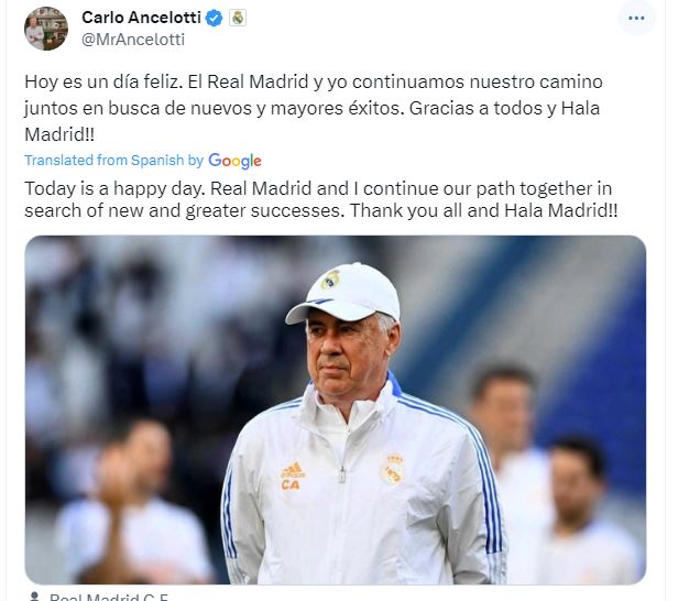 كتب أنشيلوتي عبر حسابه الرسمي على موقع X: اليوم هو يوم سعيد، نواصل أنا وريال مدريد طريقنا معًا بحثًا عن نجاحات جديدة وأكبر.. شكرا لكم جميعا، وهلا مدريد.