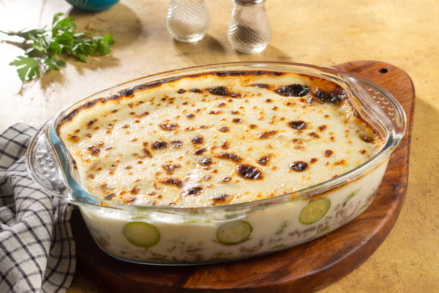 - في صينية الفرن، رتبي طبقات من الكوسة المحمصة وصلصة البشاميل.