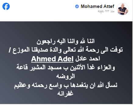 وكتب محمد عاطف، منشورًا عبر حسابه الشخصي بموقع فيسبوك، جاء فيه: إن لله وإن اليه راجعون، توفت إلى رحمة الله تعالى والدة صديقنا الموزع أحمد عادل، والعزاء غدا الاثنين في مسجد المشير قاعة الروضة، نسأل الله أن يتغمدها بواسع رحمته وعظيم غفرانه.