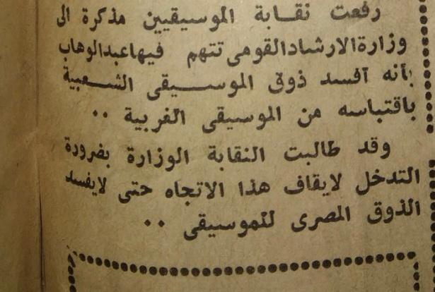 وبالعودة لأيام الزمن الجميل، نجد أن الاتهامات بإفساد الذوق العام، بدأت وقت أزمة موسيقار الأجيال محمد عبد الوهاب، حينما قدم إحدى أغنياته، واتُّهم بعدها بإفساد الذوق العام، ووقتها كانت أم كلثوم هي النقيب، حيث تم رفع مذكرة إلى وزارة الإرشاد القومي تتهم فيه عبد الوهاب باقتباسه للموسيقى الغربية، ودعت الوزارة لضرورة التدخل منعًا من نشر هذا الاتجاه، حتى لا يفقد الفن المصري هويته، ويفسد الذوق المصري للموسيقى.