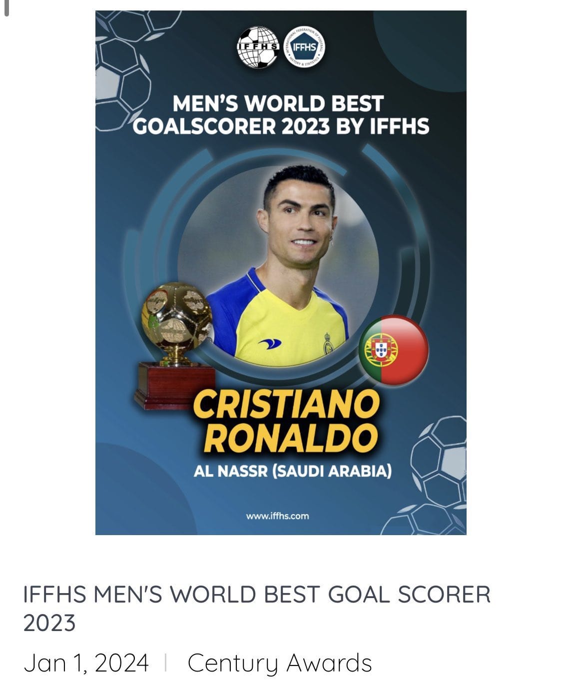 وأعلن موقع الاتحاد الدولي للتاريخ وإحصاءات كرة القدم "IFFHS" عبر حسابه الرسمي على موقع التواصل الإجتماعي تويتر، فوز النجم البرتغالي كريستيانو رونالدو مهاجم فريق النصر السعودي بجائزة هداف العالم لعام 2023.